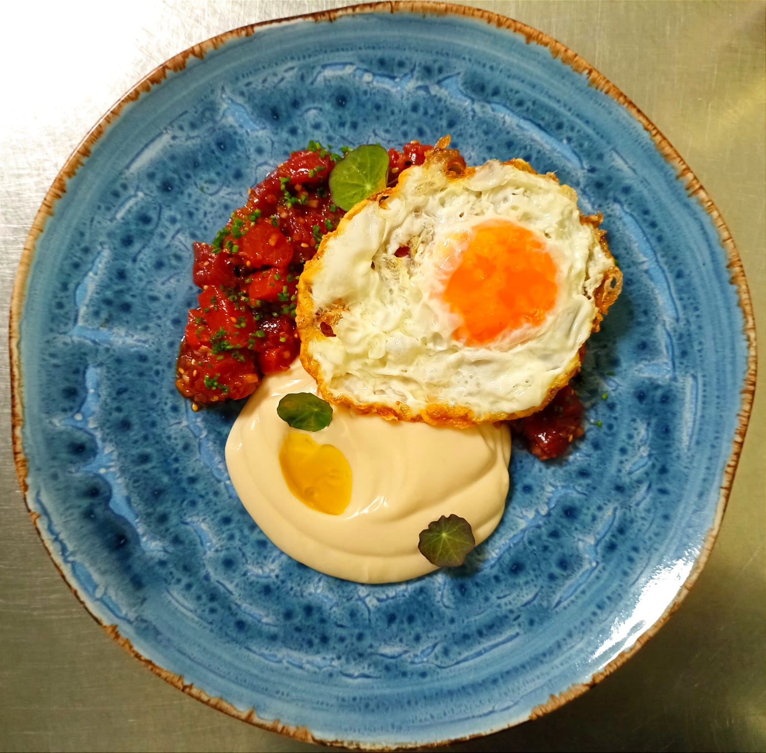 - Tartar de atún rojo con crema de coliflor avellanada y su huevo frito